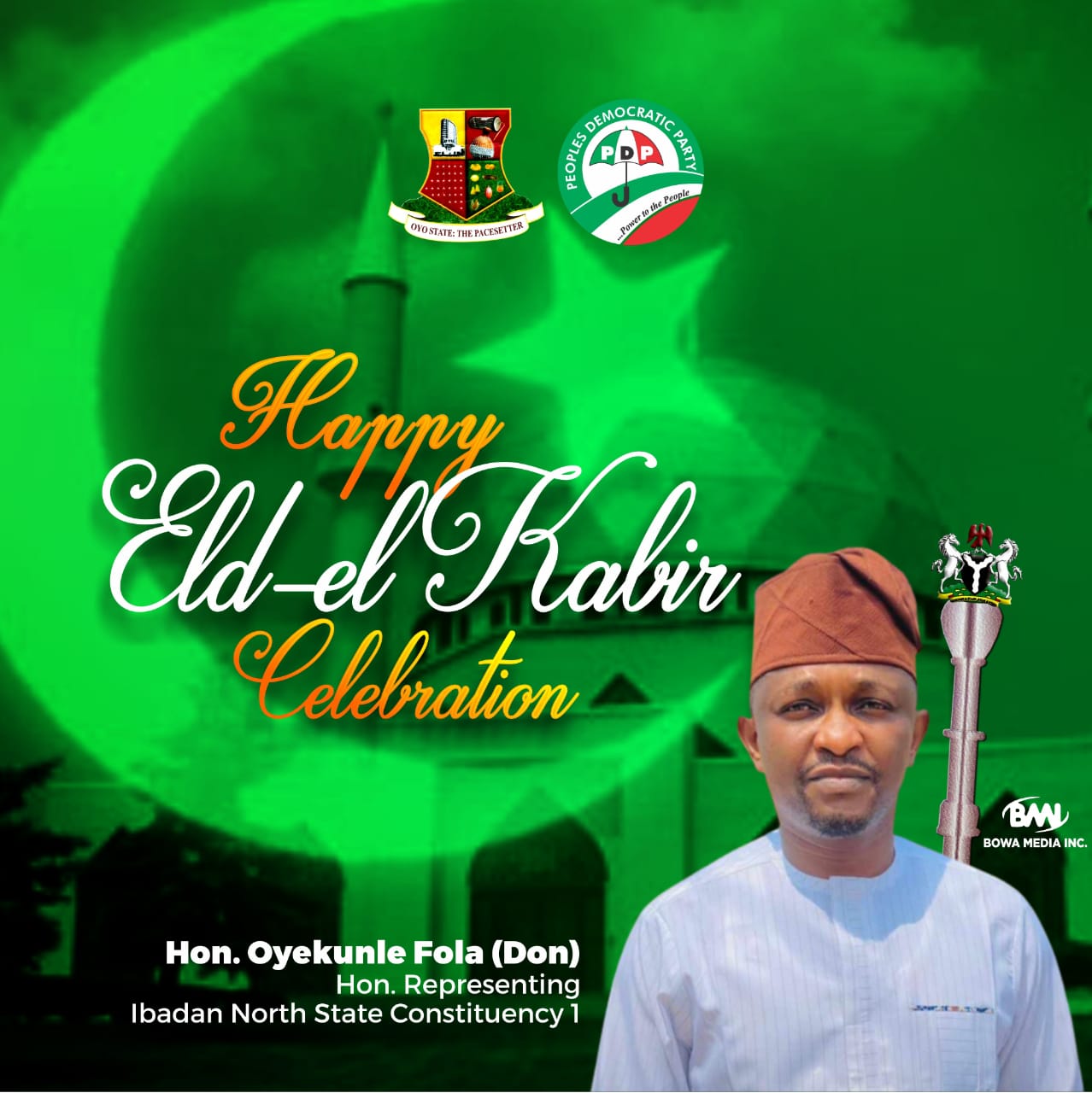 “I Hon. Fola Oyekunle (DON) warmly felicitates Muslims in Oyo state and all over the country on the occasion of the celebration of Ed-El-Kabir.