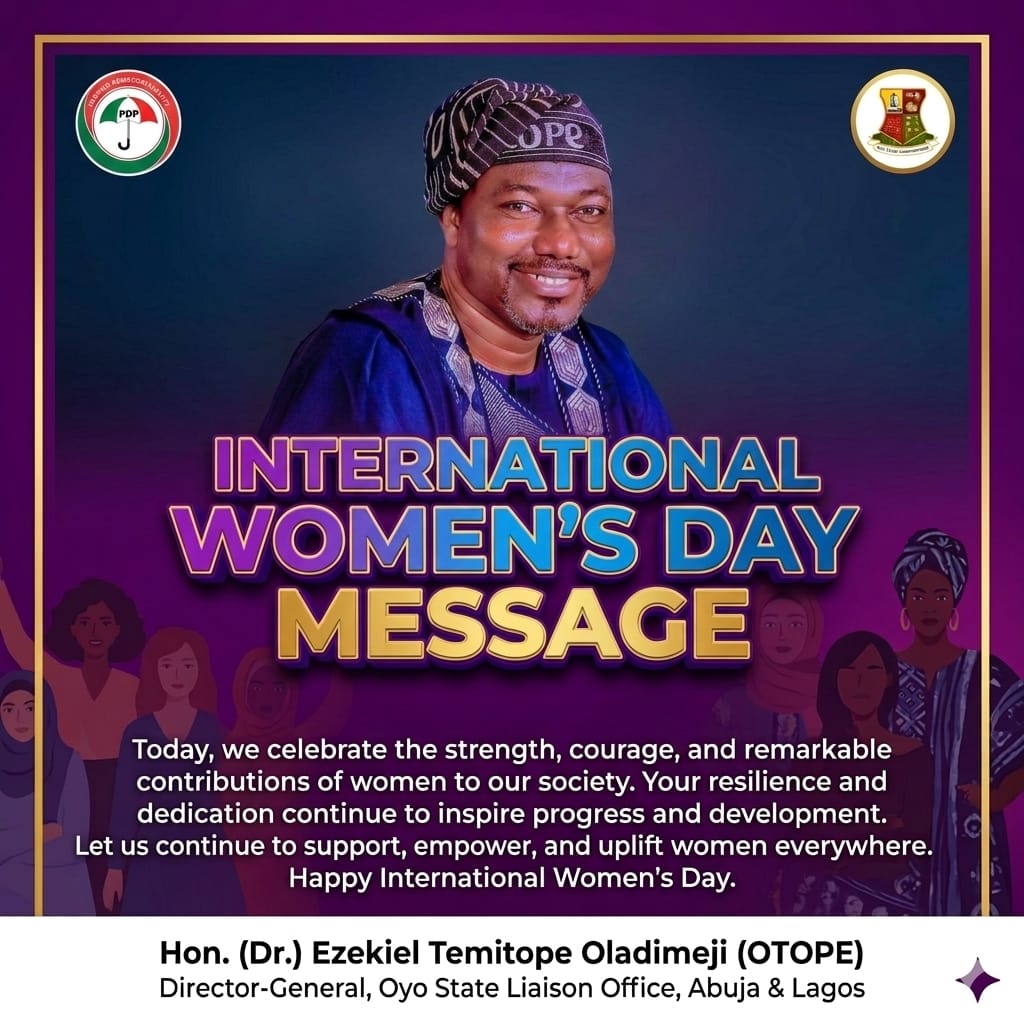 The Director-General, Oyo State Liaison Office for Abuja and Lagos, Hon. (Dr.) Ezekiel Temitope Oladimeji (OTOPE), has joined the rest of the world in celebrating women on the occasion of International Women’s Day, commending their resilience, strength, and invaluable contributions to societal development.