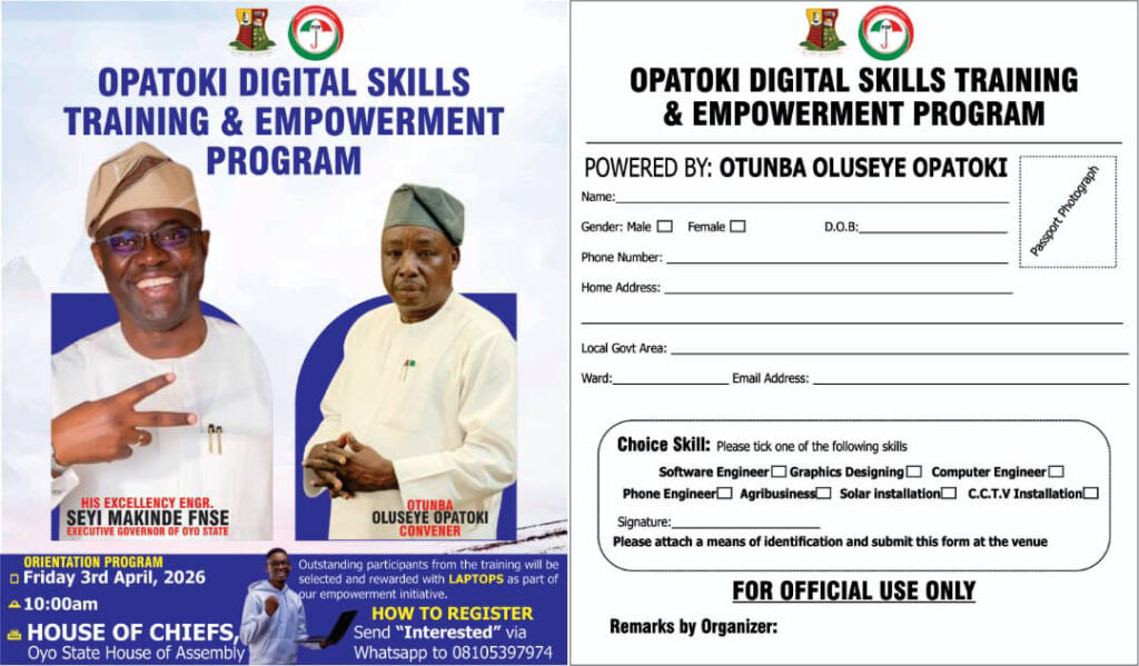 With this initiative, Otunba Oluseye Opatoki is positioning himself as a champion of youth development and economic empowerment in Oyo State, and his efforts are expected to resonate with the state’s youth and other stakeholders. As the 2027 gubernatorial election draws near, Otunba Oluseye Opatoki’s digital skills training program is likely to be seen as a significant contribution to his campaign, showcasing his vision for Oyo State’s future and his commitment to empowering its youth.