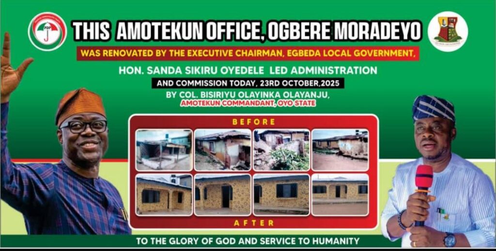 As part of the unwavering commitment of the Executive Chairman of Egbeda Local Government, Hon. Sanda Sikiru Oyedele, to combat insecurity across the council area, a new milestone was achieved with the official commissioning of the Oyo State Security Network Agency (Amotekun Corps) office at Ogbere Moradeyo, Ward 11 of the council.
